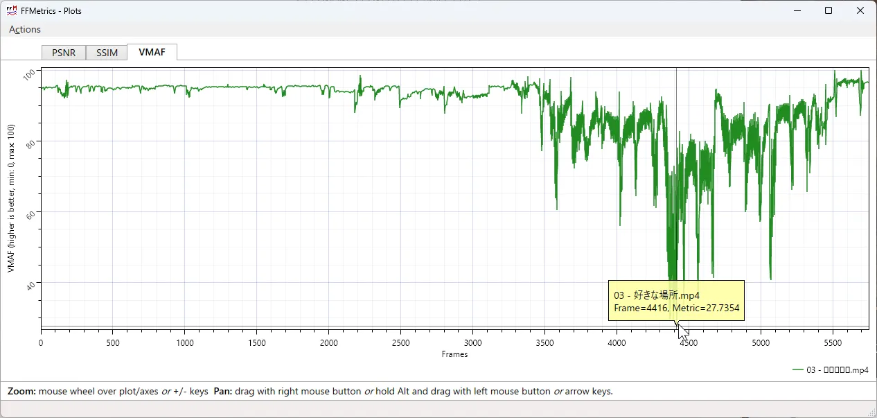 ちなみにエンディング以外のシーンでは概ねVMAF 95を保てていたので良いと思います。あと、アーティファクトも分かりにくいので、フリーレンに関してはですけど、許容できると思います。